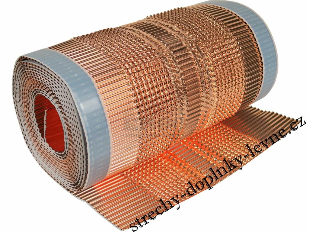 Hřebenový a nárožní pás celoměděný je vyrobený z jednoho kusu masivní mědi, nejsou zde žádné spoje (švy, lepení apod.), je plisovaný v celé šíři, perforace – mikrořez. Je ideální pro suché pokládání hřebene a nároží. Perfektně odvětrává a zabraňuje vnikání sněhu a vody. Lepicí pásky po okrajích role zabezpečují dokonalé přilnutí ke střešní krytině.